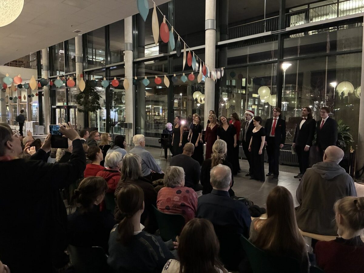 I onsdags var det dags för en viktig tradition på vårt universitet; den årliga MOMDU-julkonserten på Campus Västerås! Konserten hålls alltid i den stora lokalen vid huvudentrén, där artisterna uppträder framför de stora glasfönstren mot universitetstorget. Publiken var ännu större än vanligt och vi var mycket glada att se så många av personalen där, inklusive vår rektor Martin Hellström (som har den härliga vanan att alltid närvara vid julkonserterna).