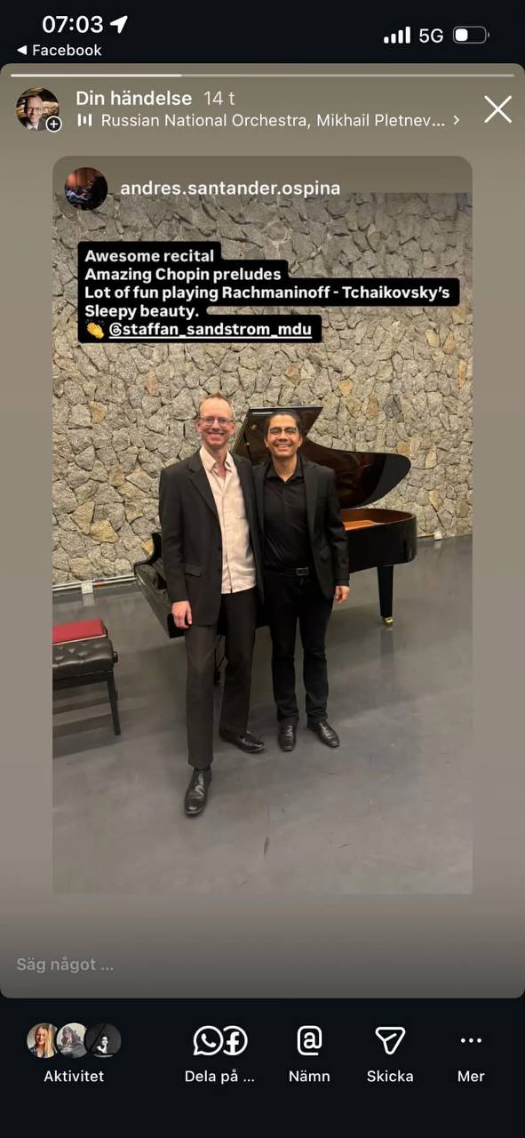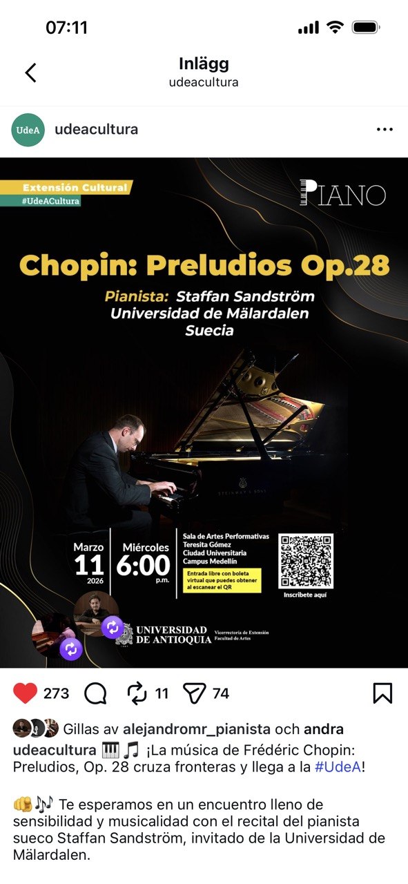 Mauricio Arias-Esguerra var med mig under veckan i Bogotá för möten, repetitioner, mästarklasser och konsert. Den här gången framförde jag hela Chopins 24 Préludier op.28 i universitetets mycket fina och helt nya Recital Hall. I Medellín ägde föreställningen rum i den vackra Sala de Artes Performativas Teresita Gómez där programmet även inkluderade Tjajkovskij arr. Rachmaninov Svit ur baletten Törnrosa för piano 4 händer med den fantastiska pianistkollegan Andrés Santander Ospina! Mästarklasserna var mycket givande med en varierad repertoar från Bach genom Chopin till den sydamerikanska kompositören Alberto Ginastera. Den senares verk var helt nya för mig och en mycket trevlig upptäckt!